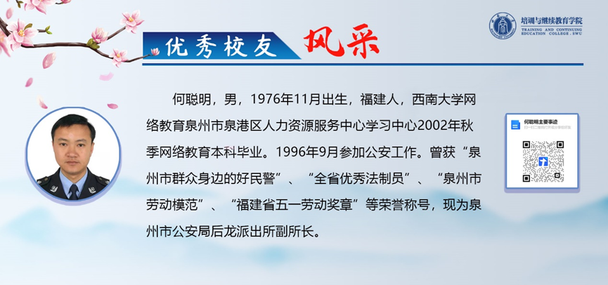 2021年7月学院面向西南大学继续教育校友会、各网络教育学习中心开展网络教育20周年优秀校友推荐工作,经过层层推选,以下优秀校友脱颖而出,接下来我们将分三期对他们的风采进行展示,欲了解更多内容,请扫描图片上的二维码。